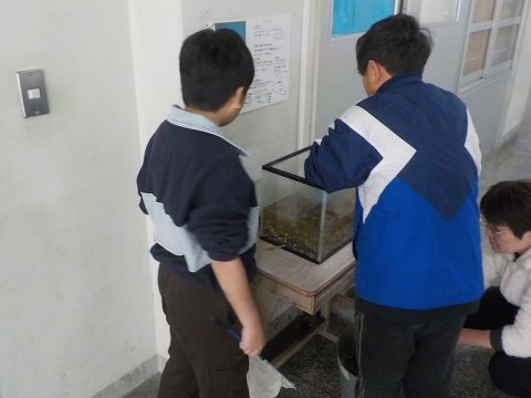 飼育委員会は、寒い中、飼育小屋や水槽のそうじにも取り組んでいました。