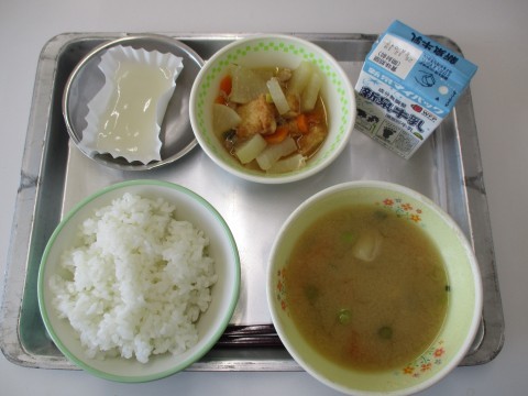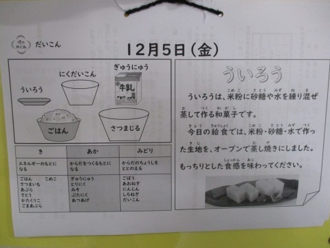 12月5日(金)本日のメニュー 公開日 2025/12/05 更新日 2025/12/05 学校給食 今日の献立は,「ごはん・牛乳・肉大根・さつま汁・ういろう」です。ういろうは米粉・・砂糖・水をまぜて蒸して作っています。もっちりとした食感でとても美味しいですよ。 +1