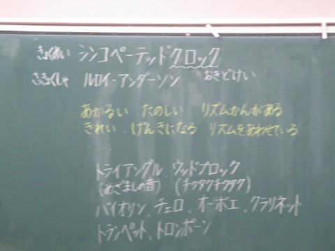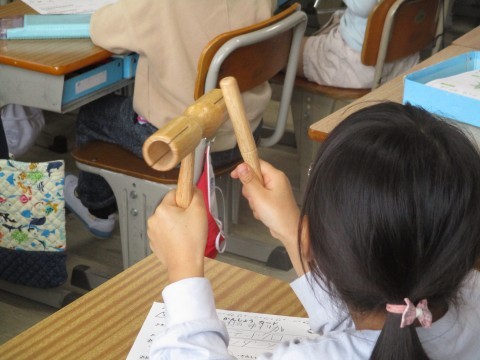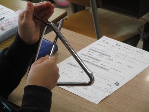 1年2組 音楽「いろいろな楽器をつかって」 公開日 2025/12/16 更新日 2025/12/16 1年生 ウッドブロックやトライアングル,カスタネットなど,いろいろな楽器を使って,明るい曲を演奏しています。リズムを合わせながら,みんなでリズムうちを楽しんでいました。 +1