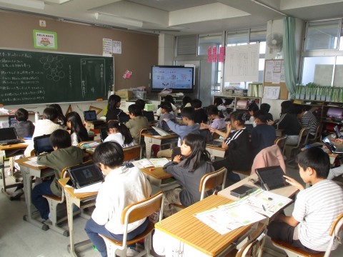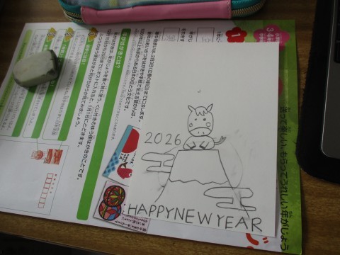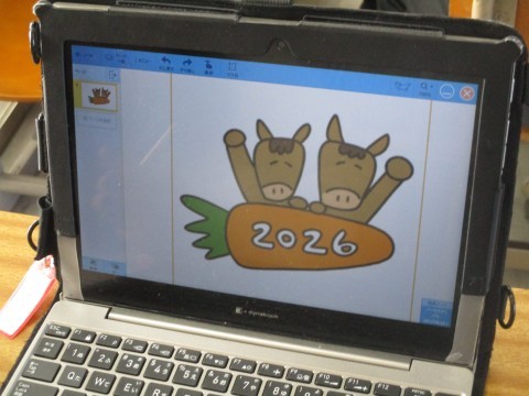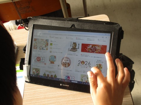 タブレットで年賀状の裏面に描くイラストを探しながら,自分らしい年賀状を書いています。