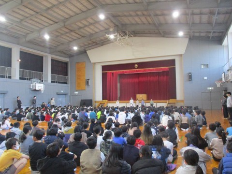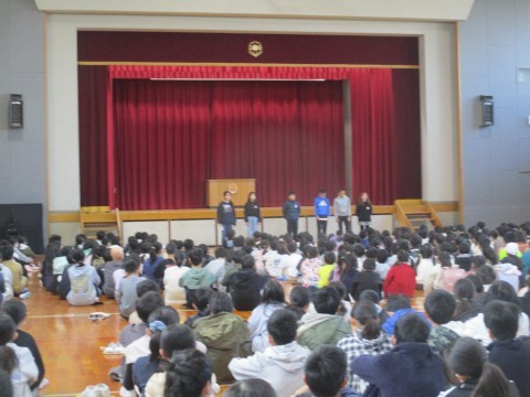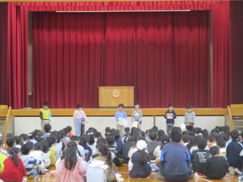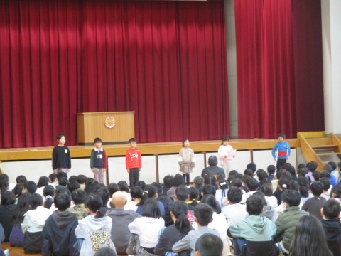 1月19日(月)にこにこ集会 公開日 2026/01/19 更新日 2026/01/19 学校行事 各学年が1年間を通して行ってきた「なかまづくり」の取り組みを発表しています。代表の児童が前に立って,学校全体へ一生懸命に伝える姿に感動しました。上野芝の子どもたちは,やさしいこころでたくましく育っています。 +3