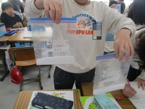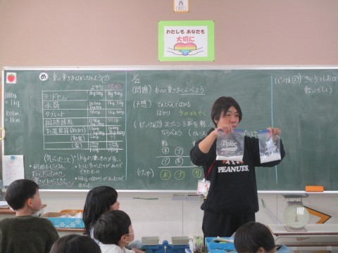 3年2組 理科「ものの重さ」 公開日 2026/01/23 更新日 2026/01/23 3年生 鉄・プラスチック・木,いろいろな材質のスプーンを上皿てんびんを使って比べています。また,同じ体積の「砂糖」と「塩」についても比べます。実際に手に持ち感覚を使いながら予想し,実験して確かめます。日常の何気ないところに,気づきが生まれますね。 +1
