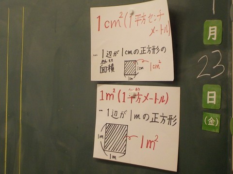 今日はより広い面積を表わすのに、1辺が10mの正方形、さらに1辺が100mの正方形について学びました。