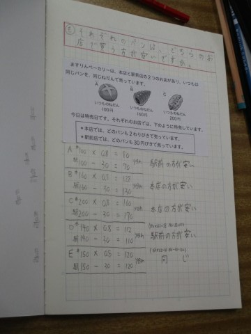 30円引きと2割引きの場合で,どちらが安いかについて調べます。