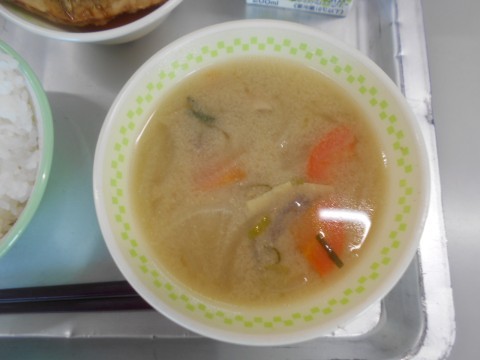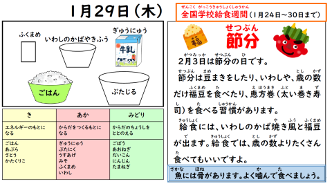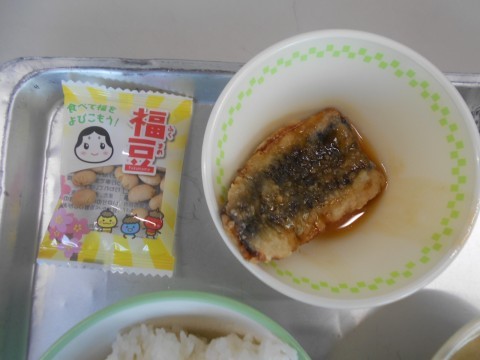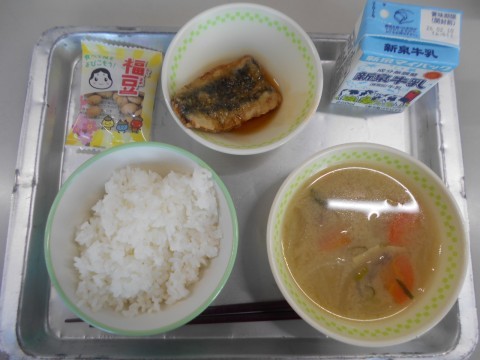 今日は「ごはん・牛乳・豚汁・いわしのかば焼き風・福豆」で,節分献立でした。