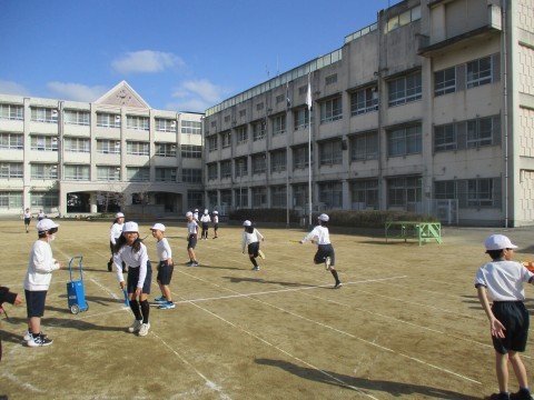 4年3組 体育「リレー」 公開日 2026/03/05 更新日 2026/03/05 4年生 バトンパスの練習をしています。初めてなのでどうしても後ろを見ながら受け取ってしまいます。全速力で受け渡しができるように,練習を重ねていました。 +1