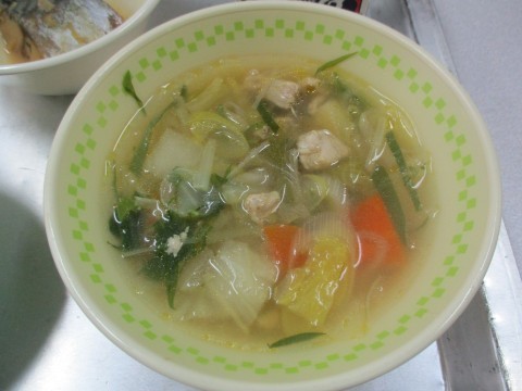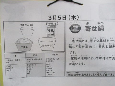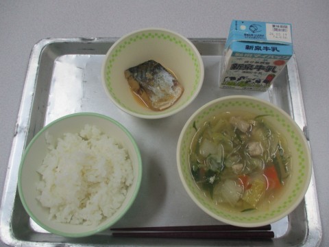 今日の献立は,「ごはん・牛乳・寄せ鍋風・さばのみそ煮」です。