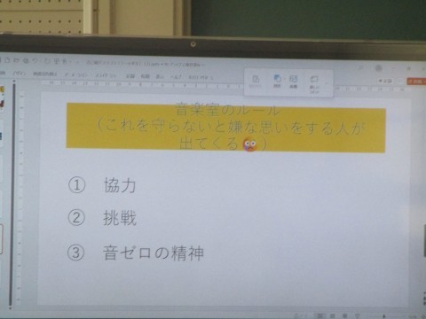 5年生 音楽の授業 公開日 2026/04/09 更新日 2026/04/09 5年生 5年生今年度初めての音楽の授業の様子です。誰もが安心して「音を楽しむ」ための音楽室のルールについて確認しています。