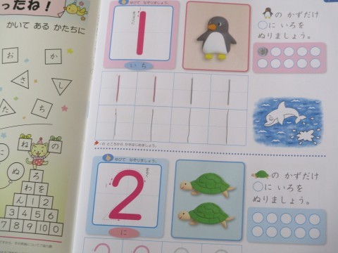 数(かず)について学んでいます。「1」を書いて、そのかずだけ色をぬっていました。