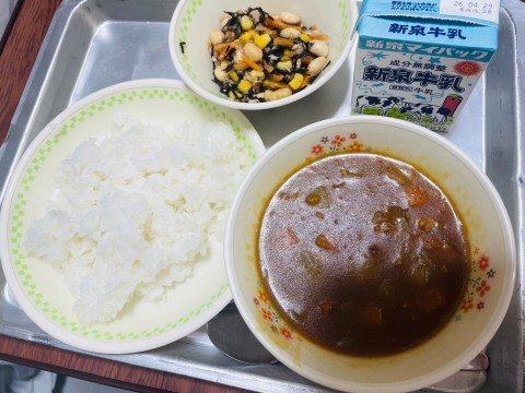 本日の給食は、ポークカレーライス、豆とひじきのサラダ、牛乳です。