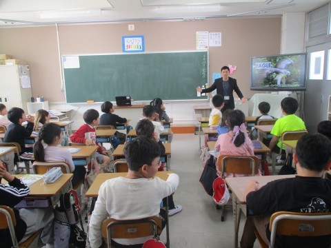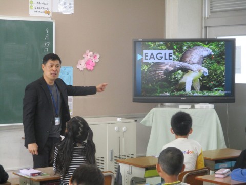 NS(ネイティブスピーカー)の先生と一緒の外国語活動の授業の様子です。