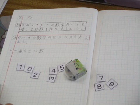 4年1組 算数「大きい数のしくみ」 公開日 2026/04/17 更新日 2026/04/17 4年生 1億よりも大きい数について調べています。「0」から「9」までの数字カードを使って、一番大きい数や一番小さい数、二番目に大きい数などについて調べています。具体的に数字カードを操作することで、『位』についての意識が生まれますね。