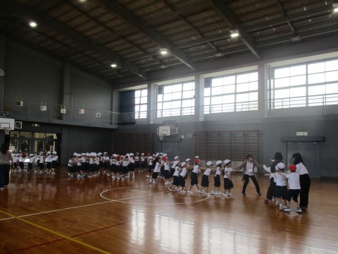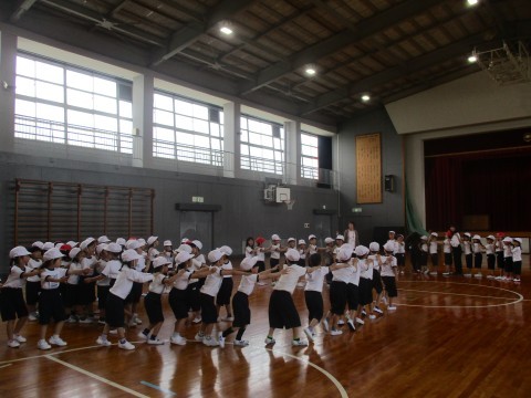 1年生 学年全体で「自己紹介ゲームとじゃんけん列車」 公開日 2026/04/17 更新日 2026/04/17 1年生 体育館で明るい声が響いていました。1年生が学年みんなで楽しく活動しています。学年目標「なかよし」になれるように、自己紹介ゲームやじゃんけん列車に元気に取り組んでいました。みんなでこころをつなぎ、なかよしになろう。 +1