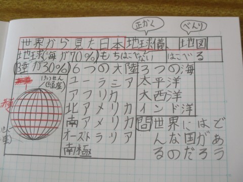 5年1組 社会「世界から見た日本」 公開日 2026/04/17 更新日 2026/04/17 5年生 地球にある「6つの大陸」「3つの海」について学びました。世界にあるたくさんの国について、どこにどのような国があるのか調べています。 +1