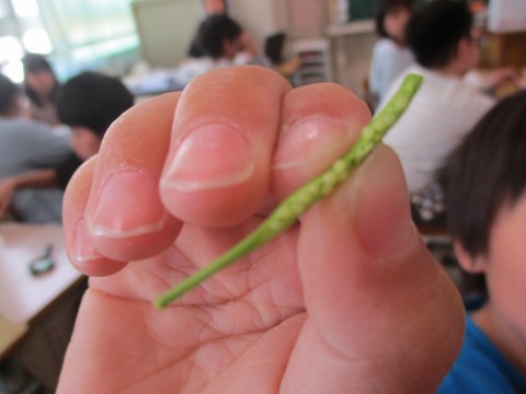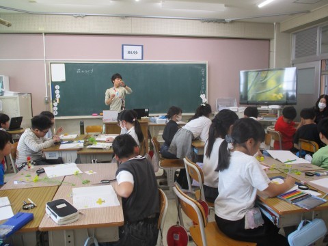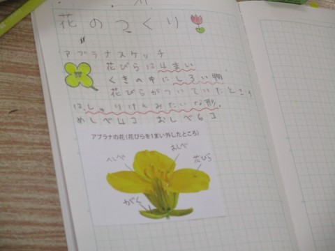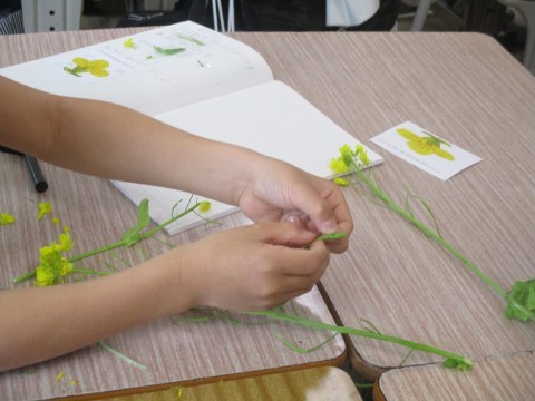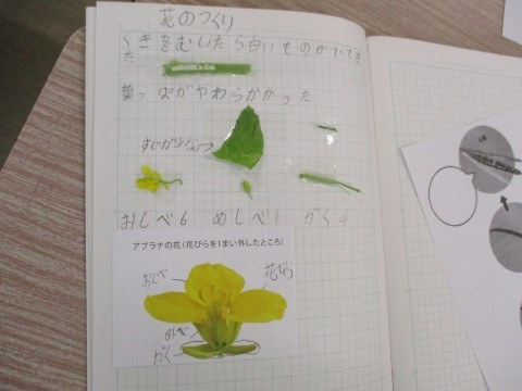 アブラナの花のつくりについて調べています。実際に、おしべ・めしべ・花びら・がくをノートに貼って、発見したことを記入していました。