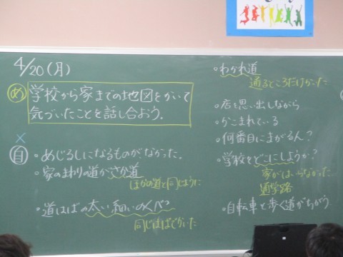 3年1組 社会「わたしたちの住んでいるところ」 公開日 2026/04/20 更新日 2026/04/20 3年生 学校から家までの地図をかいて、気づいたことを話し合っています。横断歩道や信号など目印になるものやそれの示し方などについて、考えを出し合っていました。 +1