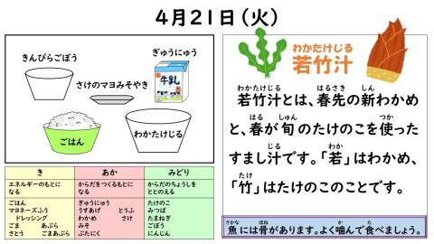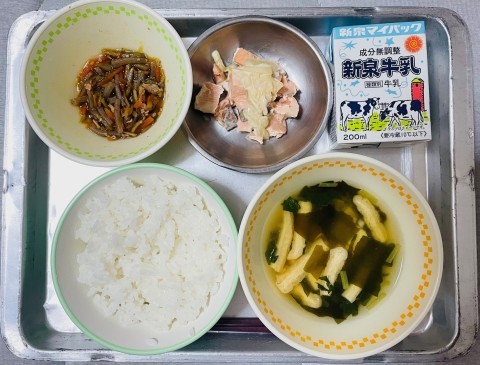 本日の給食はごはん、若竹汁、鮭のマヨみそ焼き、きんぴらごぼう、牛乳です。