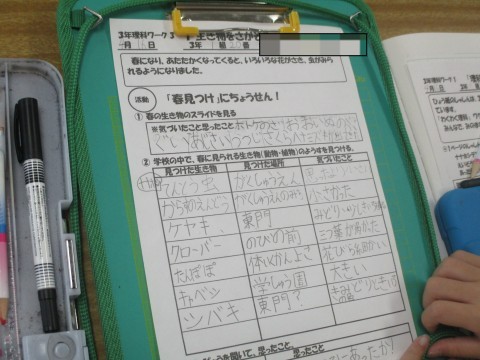 3年1組 理科「『春みつけ』にちょうせん!」 公開日 2026/04/23 更新日 2026/04/23 3年生 学校の中で春に見られる生き物をみつけ、タブレットで写真に撮ったものを見返しながら、『春』をみんなでみつけています。普段目にするいろいろな植物や動物から、春の訪れを感じるね。 +1