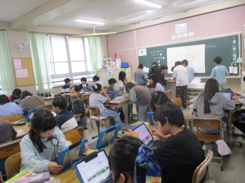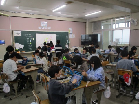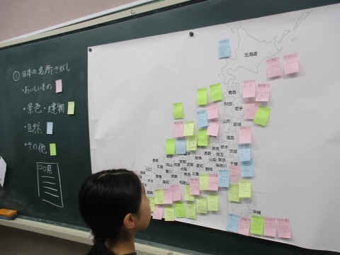 ふせんに色分けして記入し、黒板にある日本地図にみんなでまとめていきます。