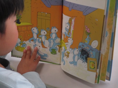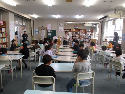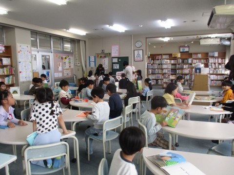 図書室で貸し出しを行っています。学校司書の先生に上手にごあいさつしていました。