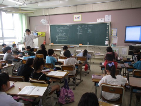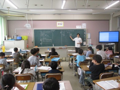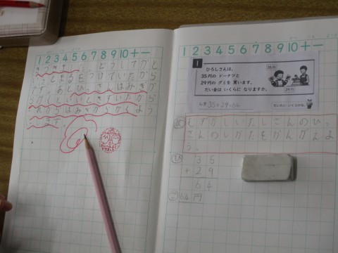 くりあがりのあるたし算のひっ算のしかたについて考えています。
