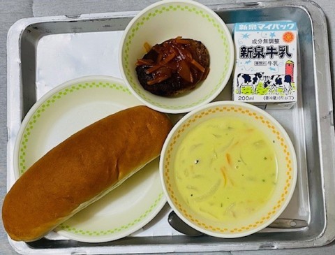 本日の給食は、コッペパン、グリーンポタージュ、ハンバーグの野菜ソース、牛乳です。