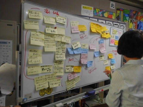 スーパーマーケットでお店が工夫していることから、お店の人は、買う人の立場や気持ちになっていることに、どのようにすれば繋ぐことができるか、また、子どもたちの見方がどのように広がっていくかを教員同士で話し合いました。