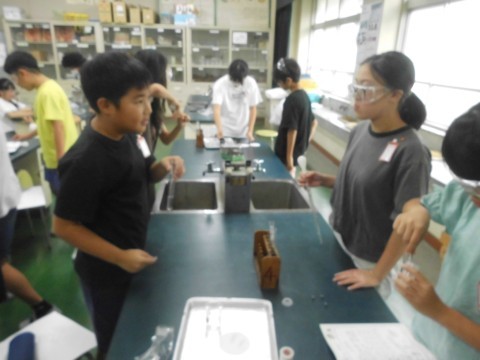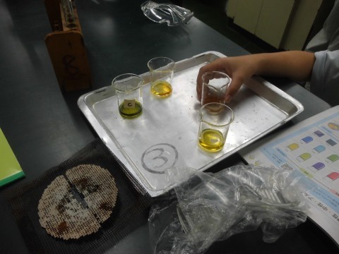 3つの水溶液が、どのような水溶液なのかを、スチールウールを入れたり、BTB液で調べたりして、見つけ出そうとしています♪