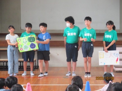 保健委員会・給食委員会の児童が,朝礼で10月の保健目標と目に良い食べ物について発表しました。