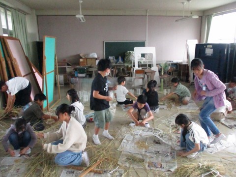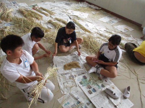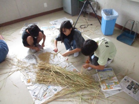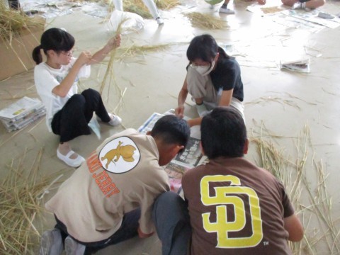 刈り取った稲を藁と稲穂に分けていました♪