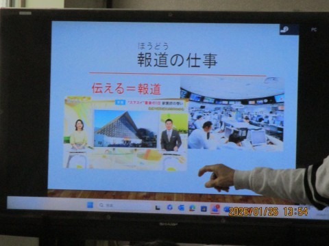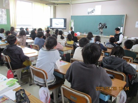 26(月) 5年生 テレビ局の方に来ていただきました♪ 公開日 2026/01/27 更新日 2026/01/27 学校 テレビ番組を制作しているテレビ局の人に来ていただき,どのように番組が作られるのか,どのような仕事があるのかを教えていただきました。そして,その思いも伝えていただきました。報道のことについての学びとなるとともに,お仕事についても考える機会となりました。お忙しい中,どうもありがとうございました。
