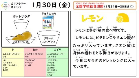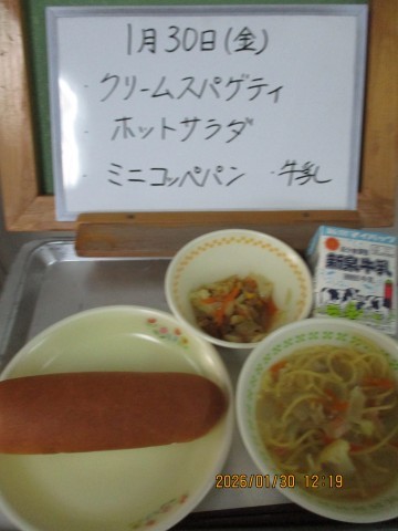 1/30(金)の給食♪ 公開日 2026/02/02 更新日 2026/02/02 学校 給食調理員さん,いつもありがとうございます。当番さん,一週間ごくろうさまでした。おかげさまで毎日おいしくいただいております。 +3