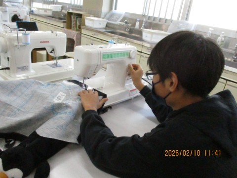 ミシンを使って,エプロンを縫っています♪