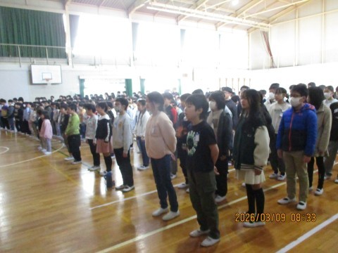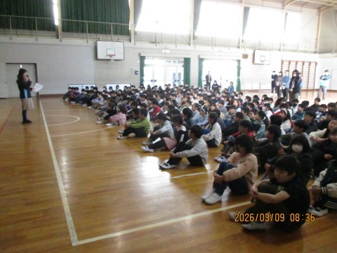 全校朝会♪ 公開日 2026/03/09 更新日 2026/03/09 学校 校歌を歌いました。校長先生からは,このあとの「6年生を送る会」についてのお話がありました。「ノートグランプリ」の表彰をしました。