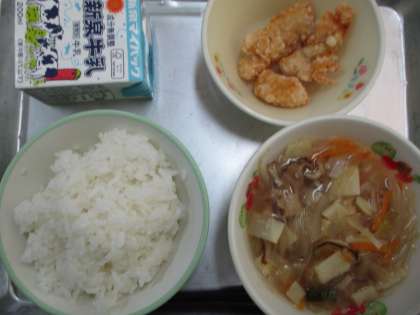 今日の献立は ごはん 牛乳 春雨スープ 鶏のから揚 です。 今日もおいしくいただきます(^^♪