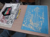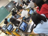 5年生が取り組んでいる木版画。彫刻刀でさいごの仕上げをしたり友だちと協力して刷っ...