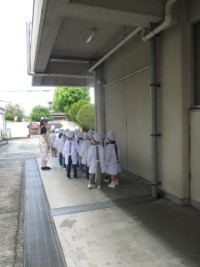 児童の避難訓練のあと,先生たちで消防車が入ってくるルートを確認したり,消火栓の使...