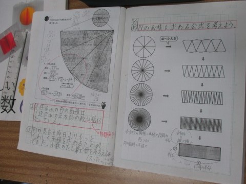 円を細かくおうぎ型に等分して、並び替えて考えていました。