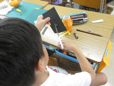 カッターで画用紙を切って作ったカボチャに目や鼻などを飾りつけ,