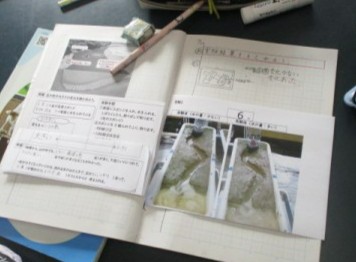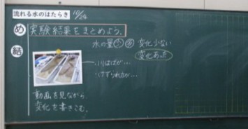 実験を動画や写真で記録したものをもとに流れる水のはたらきについて考えました。