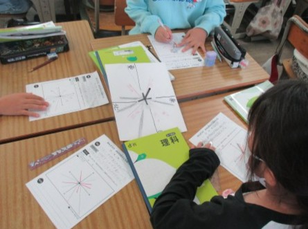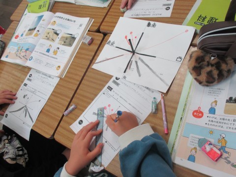 先日,手作りの記録用紙を使って,かげの向きと太陽の位置を調べました。