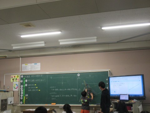 ノートに書いた自分の考えを,黒板を使って説明していました。