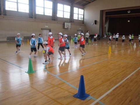 今日は,すきまを見つけてうまく仲間にパスをする練習をしていました。