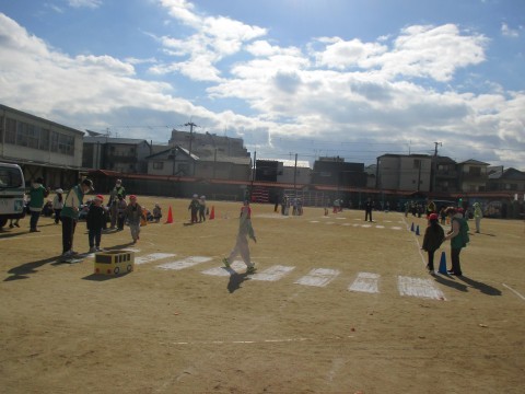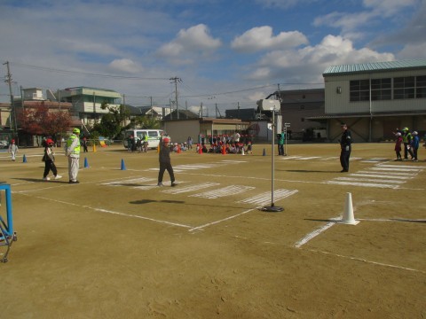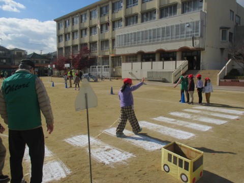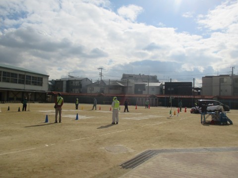 運動場に信号や標識を設置し,道路や横断歩道をかいて