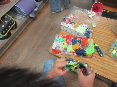 白いねんどに絵の具を混ぜ込んでカラフルねんどを作り