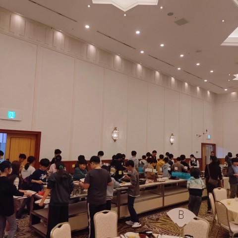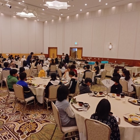 朝食会場のようすです。子どもたちは元気いっぱい、朝ご飯を食べています。