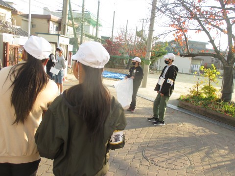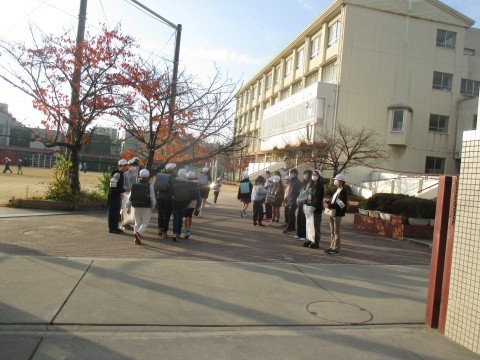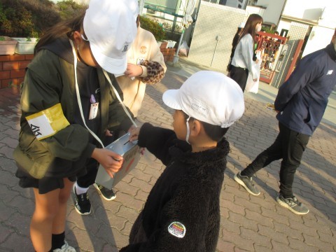 朝,児童会役員の人が校門に立って