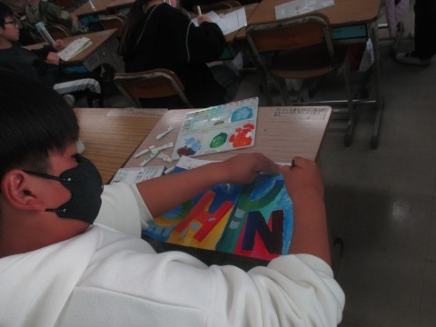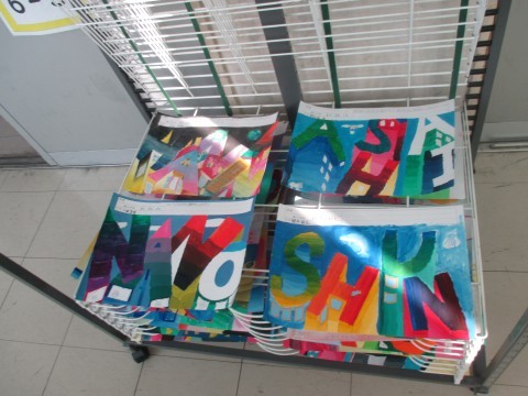 6年生は自分の名前をタワーのようにデザインする絵に取り組んでいます。