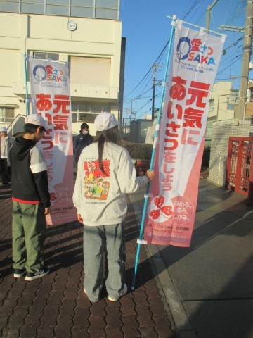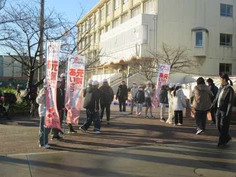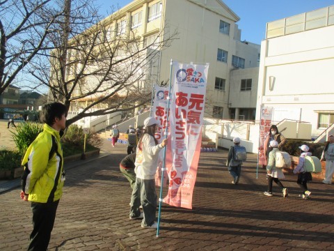 朝,児童会役員の人たちと,生徒指導担当の先生たちが校門に立って