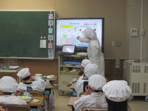 1年生の教室では,栄養教諭の先生が